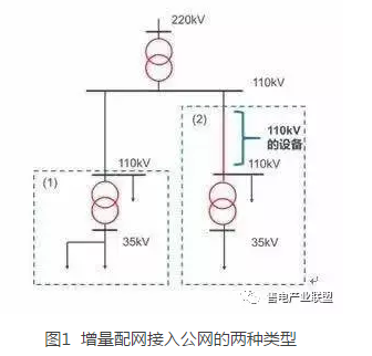 根据接入公网位置的不同,增量配网可分为两种类型:一类是接在增量配网的变压器接线处,另一类接在公网变压器馈线处,两种类型地方电网的主要区别在于主网与配网连接设备的所有权不同,如图1中的(1)和(2),类型(1)中110kV输电线路及相关设备为公共电网所有,类型(2)中 110kV输电线路及相关设备为增量配网所有。按暂行办法,第(1)类中增量配网专用的110kV接入线路及相关设备将由所有公网用户共同分摊,而第(2)类增量配网专用的110kV接入线路及相关设备将由增量配网用户分摊,显而易见后者分摊原则更为公平。